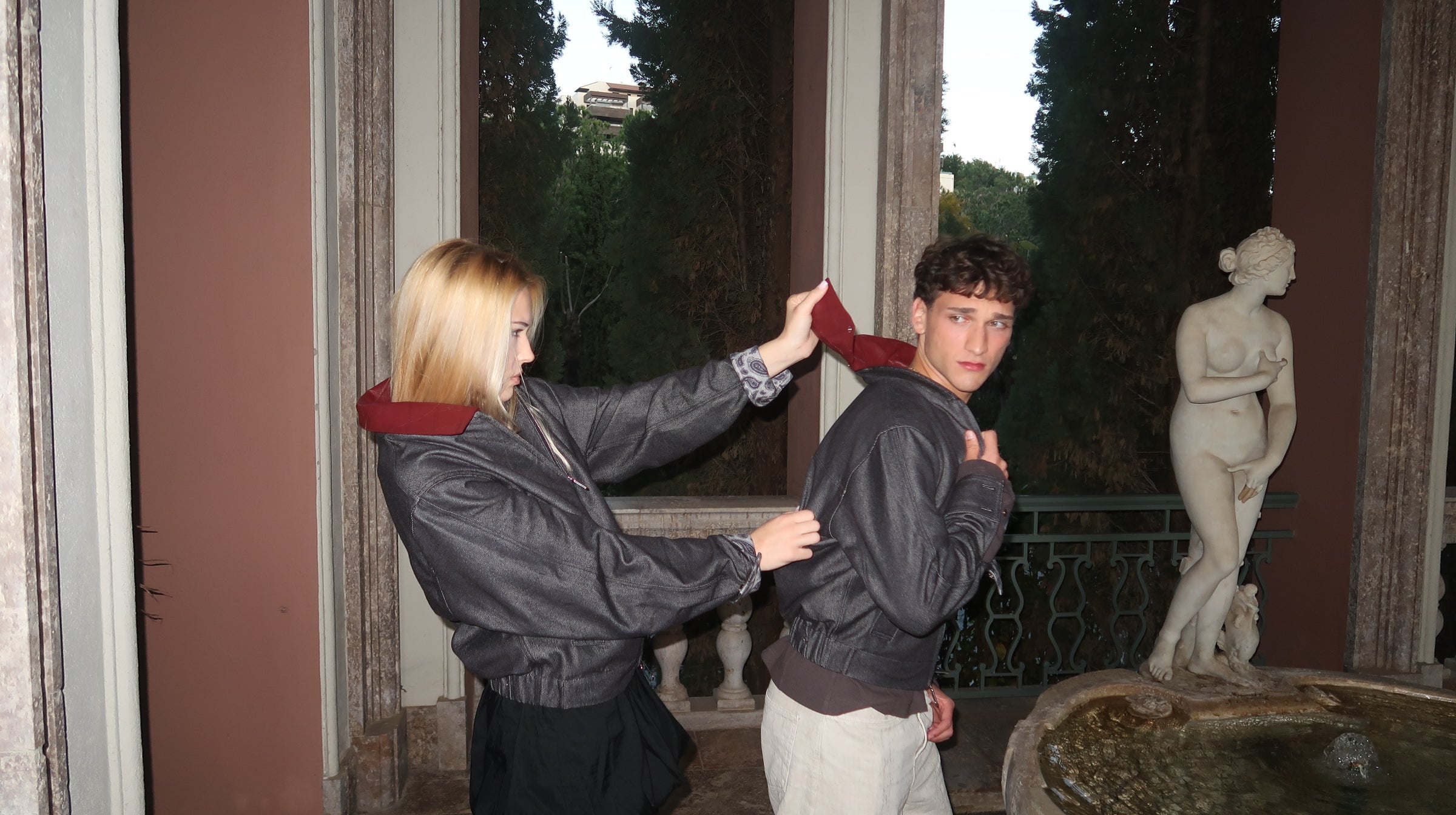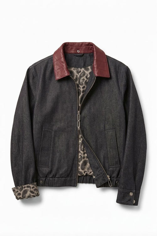 This structured zip-up jacket blends sharp tailoring with a subtle edge, featuring a refined silhouette and a contrasting collar that adds depth without overpowering. The textured fabric gives it a slightly raw, lived-in feel, while the double-zip closure allows for effortless styling—worn open or precisely fitted.