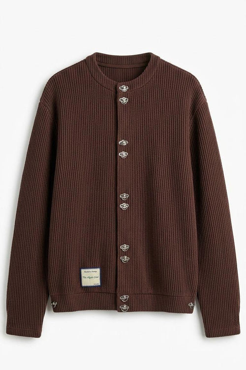 A refined essential designed for transitional days, this ribbed cardigan blends effortless structure with understated elegance. Crafted in a rich earthy tone, it captures the warmth of spring light while maintaining a timeless, elevated silhouette.
